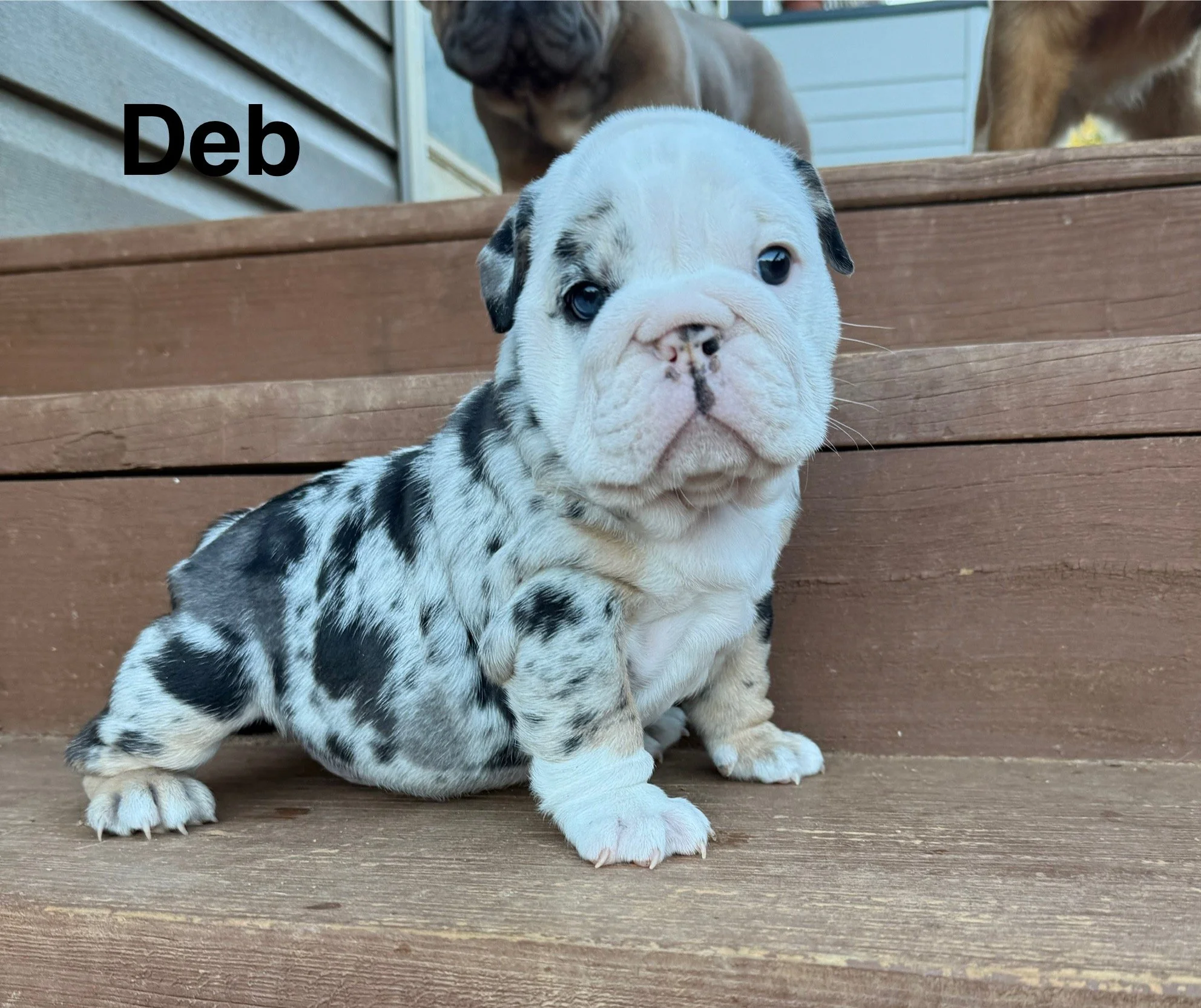 Deb is our only remaining English girl. She is a stunning black and tan merle girl and the sweetest little baby. $4300